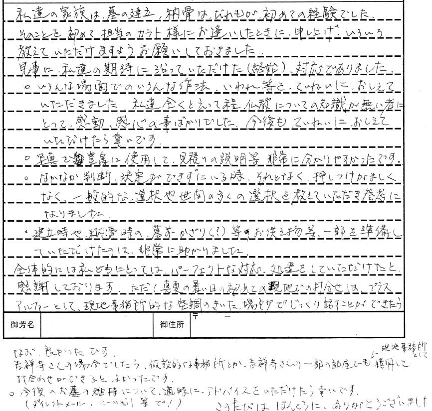 一族からも良い評価を得て安堵しております。 この度の墓石建立に際し、営業の唐渡さんには細部に渡り、ご教授 頂き、ありがとうございました。知識も経験もない一大事業に戸惑い悩んでおりましたが、お陰様で 滞りなく事が進み完成に到りました。一族から... -