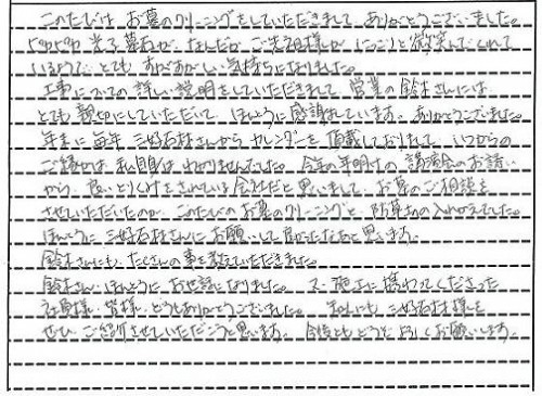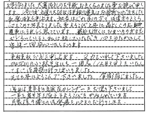 心ゆたかにして家族一同安心いたしております。 お寒うなりました。大変お礼のお手紙、おそくなりました事お詫び申します。この度私達の大切な御先祖の建立をして、お骨折りいただきました事厚く御礼を 申し上ます。社長はじめ多くの方々に御遠方のところ... -