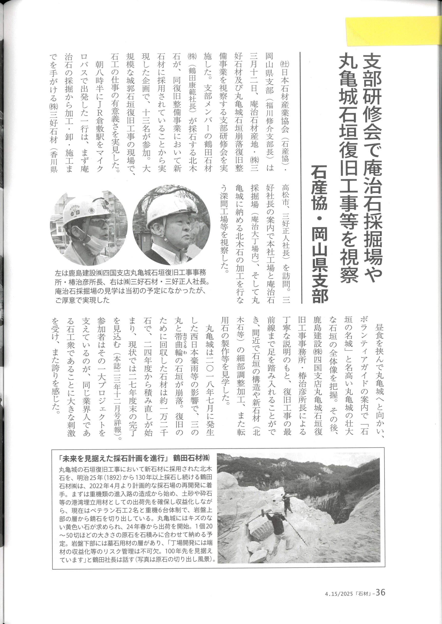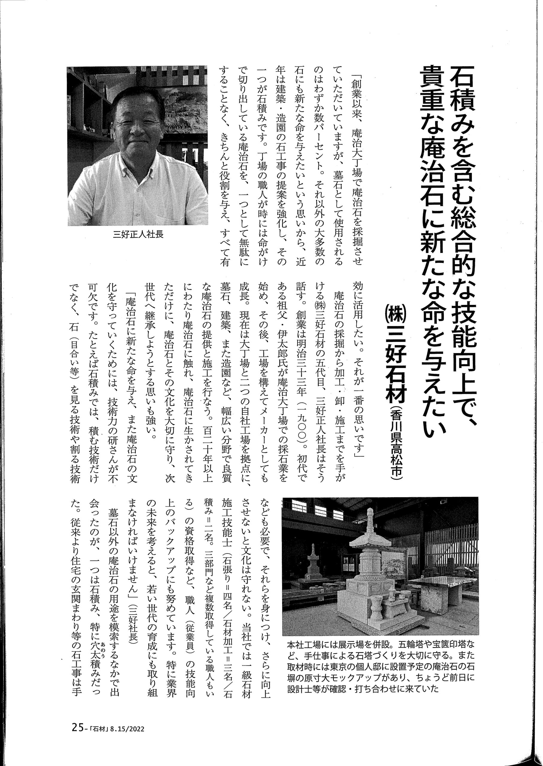 | 加盟団体など | 庵治石大丁場の会 庵治石開発協同組合 庵治石普及部会(理事長) 一般社団法人日本石材産業協会 全国建築石材工業会 全国福禄寿会 全国仏教墓塔研究会 高松市牟礼庵治商工会 |