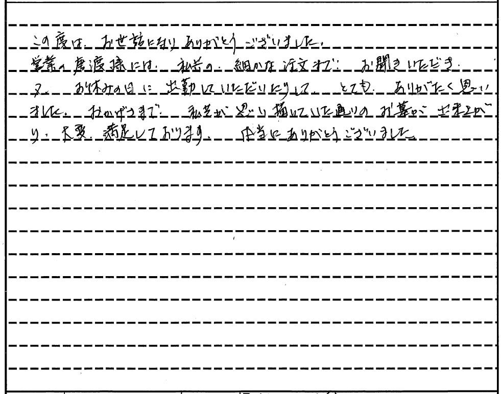 おかげさまで私共が思い描いていた通りのお墓が出来上がり、大変満足しております。本当にありがとうございました。