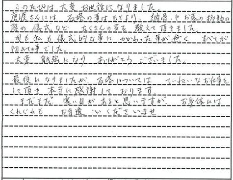 唐渡さんには、石塔の事はもとより、納骨やお墓の移動の際の儀式など たくさんの事を教えて頂きました。 母も私も儀式的な事にかかわった事が無く、すべてが初めての事でした。 大変勉強になり、ありがとうございました。