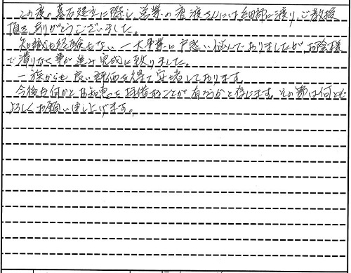 知識も経験もない一大事業に戸惑い悩んでおりましたが、お陰様で滞りなく事が進み完成に到りました。