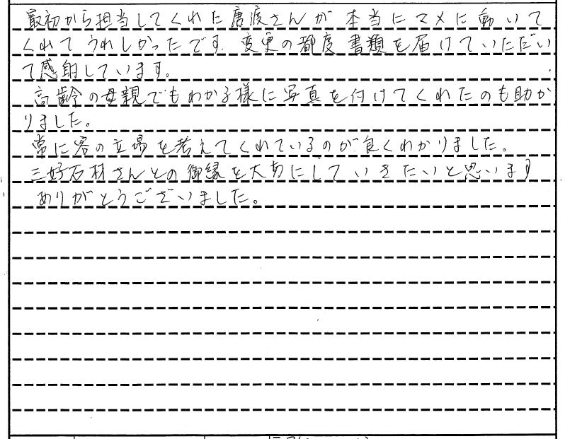 M様(高松市扇町在住) 2024 12/21 お客様の声 2024年12月21日 目次常に客の立場を考えてくれているのが良くわかりました。 最初から担当してくれた唐渡さんが本当にマメに動いてくれてうれしかったです。変更の都度書類を届けていただいて感謝してします。高齢の母親でもわかる様に写真を付けてくれたのも助かりました。常に客の立場を考えてくれているのが良くわかりました。三好石材さんとの御縁を大切にしていきたいと思います。ありがとうございました。 お客様の声 よかったらシェアしてね! URLをコピーしました! URLをコピーしました! A様(高松市桜町在住) H様(高松市多賀町在住) 関連記事 H様(高松市多賀町在住) 2024年12月21日 A様(高松市桜町在住) 2024年12月21日 S様(高松市成合町在住) 2024年12月21日 O様(高松市勅使町在住) 2024年12月21日 I様(高松市東山崎町在住) 2024年12月21日 Y様(高松市在住) 2024年12月21日 T様(高松市浜ノ町在住) 2024年12月21日 Y様(高松市円座町在住) 2024年12月21日