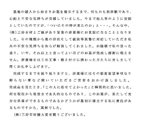 お陰様で私の思った通り、いや、それ以上と言ってよいほどのお墓が完成し感謝に堪えません。唐渡様をはじめ工事・据え付けに携わった方たちに対しまして厚くお礼申し上げます。