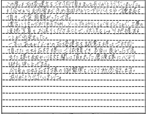 この度は石塔建立をご対応いただきましてありがとうございました。