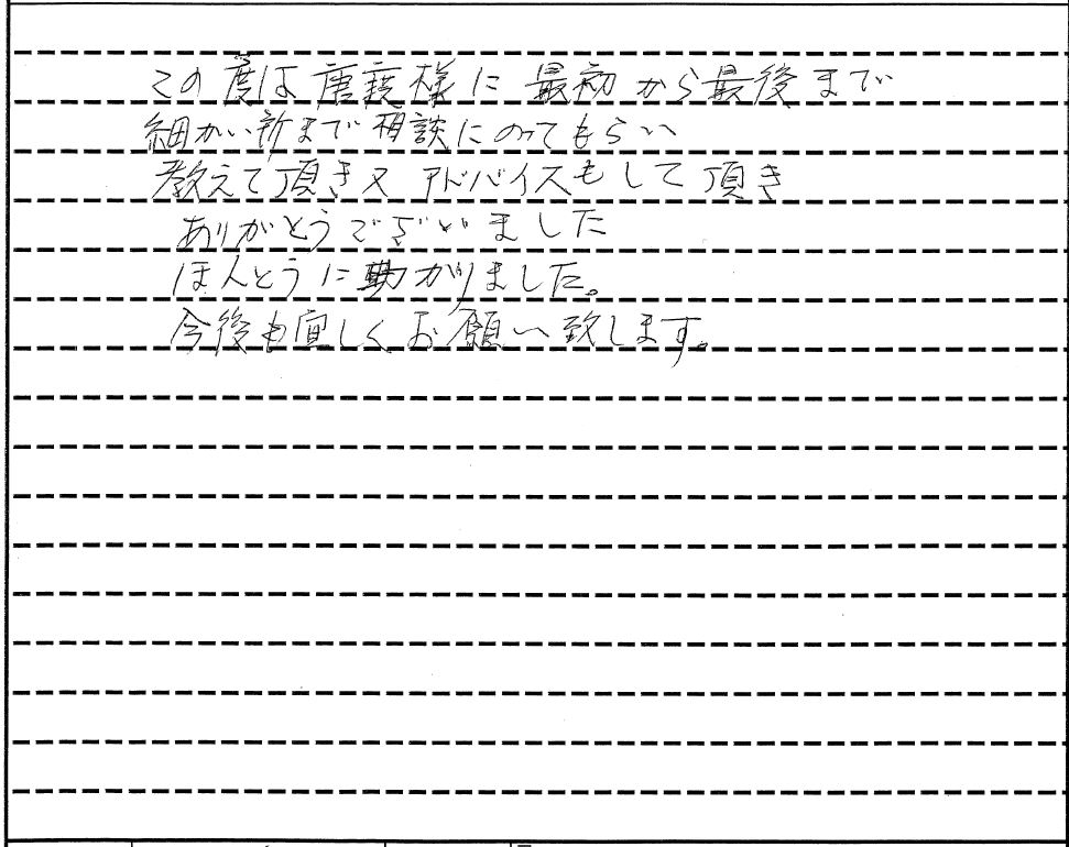 この度は唐渡様に最初から最後まで細かいところまで相談にのってもらい、教えて頂き又アドバイスもして頂きありがとうございました。ほんとうに助かりました。