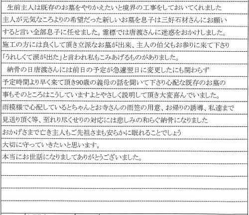 施工の方には良くして頂き立派なお墓が出来、主人の伯父もお参りに来て下さり「うれしくて涙が出た」と言われ私もこみあげるものがありました。