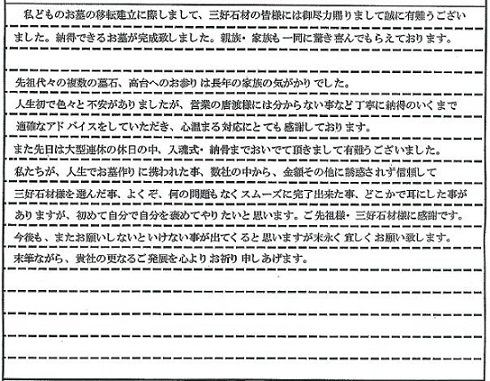 私どものお墓の移転建立に際しまして、三好石材の皆様には御尽力賜りまして 誠に有難うございました。納得できるお墓が完成致しました。親族・家族も一同に 驚き喜んでもらえております。
