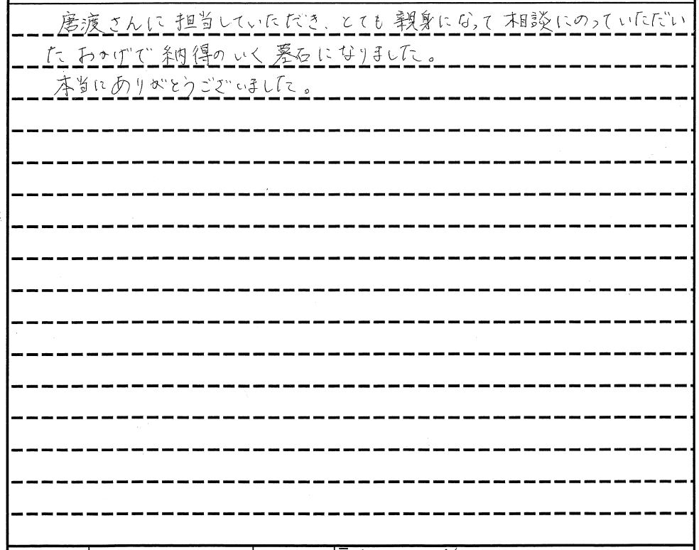唐渡さんに担当していただき、とても親身になって相談にのっていただいたおかげで納得のいく墓石になりました。